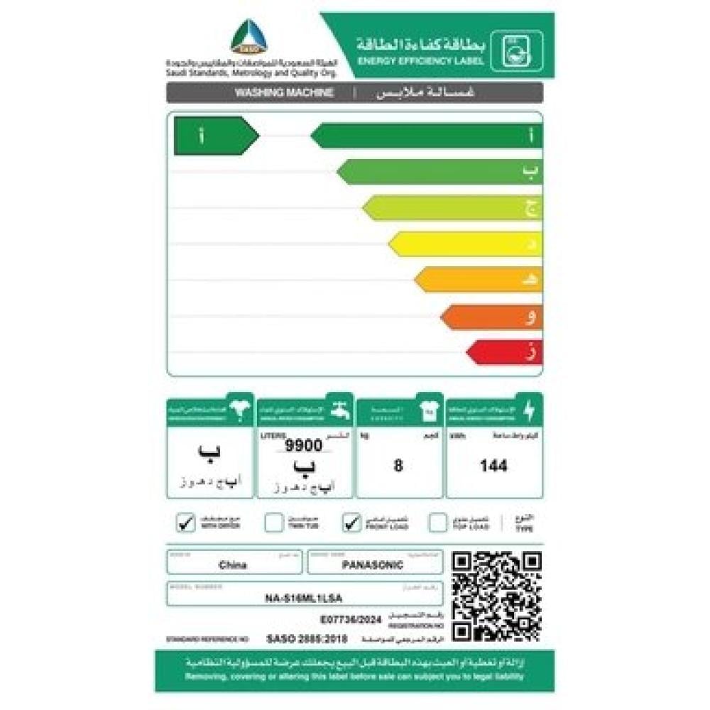 غسالة باناسونيك أمامية 8 كجم مع تنشيف 6 كجم – فضي – موديل NA-S16ML1LSAالمواصفات الأساسية: